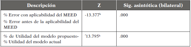 Como se puede observar en la Tabla 17, el sig. es 0.00 < 0.05, lo que evidencia la existencia de diferencias entre las dos evaluaciones sobre el mismo grupo de emprendimientos, siendo el valor Z mayor que el nivel de la confianza al 95%=1.96. Es decir, el valor Z calculado de -13.377b y 13.795b cae en la zona de rechazo a dos colas de distribución, por lo que se puede corroborar que existe un cambio significativo en el % de error del pronóstico y del porcentaje de utilidad luego de la aplicación del MEED, por lo tanto, rechazamos Ho y aceptamos H1.