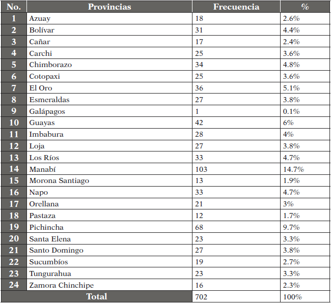 Según se observa en la Tabla 2, el mayor número de emprendimientos implementados se encuentran en la provincia de Manabí, con un 14.7%, correspondiente a la implementación de 103 emprendimientos y un valor insignificante en la provincia de Galápagos con un 0.1%. También se puede apreciar que las provincias donde más emprendimientos se implementan son las provincias de Pichincha (capital Quito) y Guayas (capital Guayaqui) con un 9.7% y 6% respectivamente, coincidentemente en que son las dos provincias con mayor densidad poblacional del Ecuador.