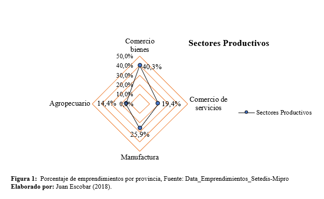 En la Figura 1 se observa un porcentaje del 40.3% de emprendimientos asesorados e implementados en el sector comercio de bienes, seguido del sector manufactura con el 25.9%. Juntos representan más del 50% de la variable en mención, mientras el sector servicios contempla el 19.4%, y el sector agropecuario cubre el 14.4% a escala nacional. Esto evidencia que los emprendedores en su mayoría optan por emprender en negocios de naturaleza tangible-comercial.