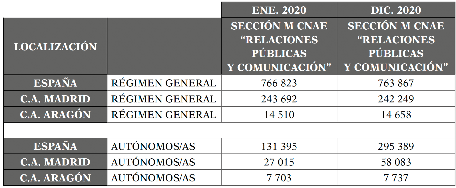 En cuanto al número de empresas inscritas en la Seguridad Social, según el informe elaborado por el Ministerio de Trabajo a diciembre de 2020, las empresas dedicadas a este tipo de actividades en diciembre de 2019 pasaron de 94 001 en el conjunto de España, a 92 843 en el mismo mes, pero de 2020. En diciembre de 2020, el número de personas registradas en este sector de Relaciones Públicas y Comunicación en todo el país era de 763 867. En el régimen de autónomos, esta misma sección aglutinaba a 295 389 personas. Es esta una tendencia decreciente (Marta-Lazo et al., 2018) que ya se venía experimentando en el sector, aún antes de la crisis actual.