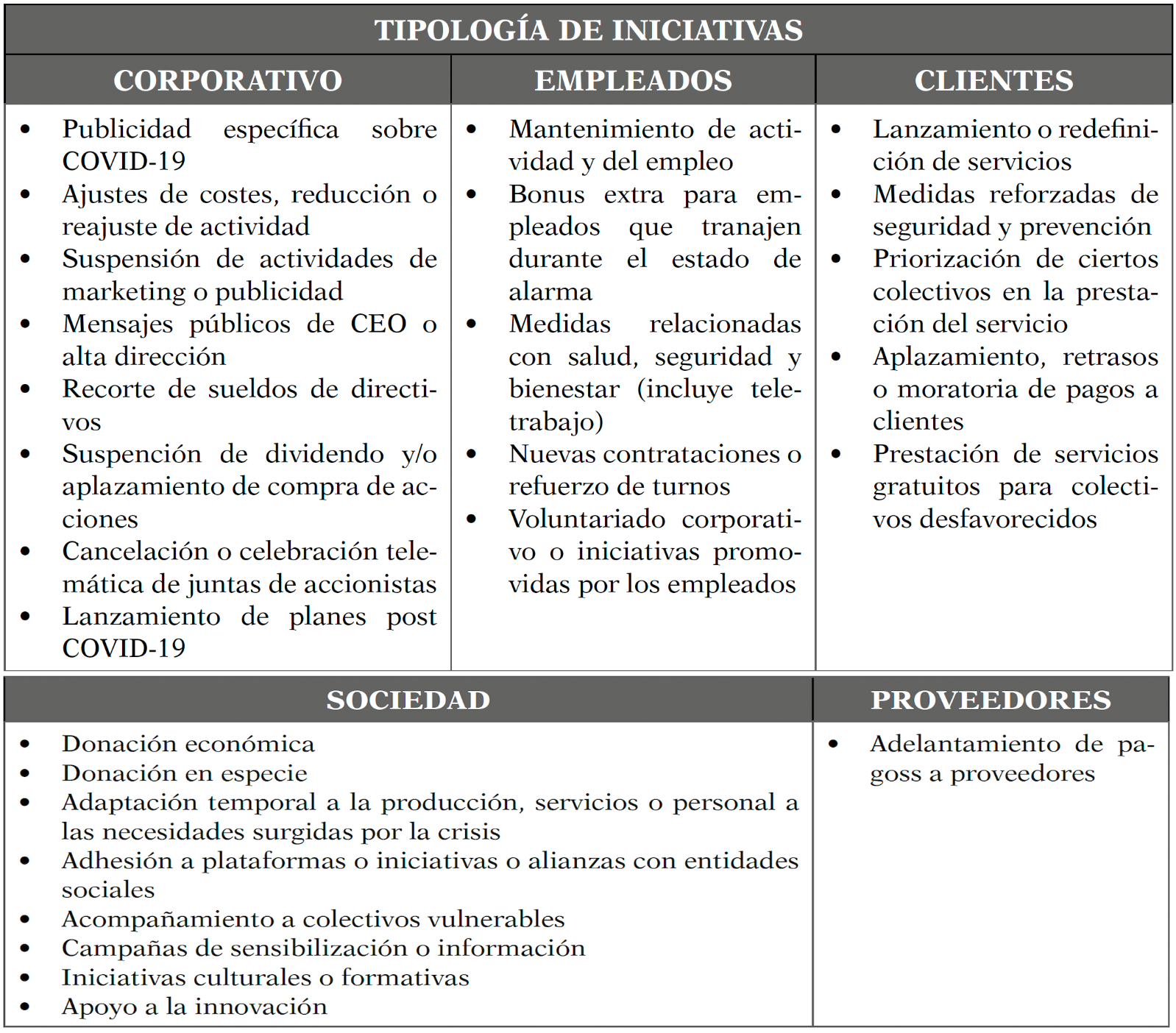 Una de las evidencias que ha dejado la pandemia en el ámbito económico y social ha sido el refuerzo de la implicación de las organizaciones con sus grupos de interés, en el ámbito de responsabilidad social de su actividad. Entre el 14 de marzo de 2020 (el día anterior a la entrada en vigor en España del Estado de Alarma) y el 14 de abril de ese mismo año, según un informe de la consultora CANVAS (2020) se han identificado vinculadas a la COVID-19, más de 650 iniciativas empresariales y más de 9000 impactos en medios de comunicación protagonizados por las grandes empresas, pymes y autónomos/as. Algunas de estas iniciativas han sido donaciones, acciones solidarias o adaptaciones de los modelos de producción dirigidas a todos los grupos de interés, desde empleados a clientes y proveedores, hasta la sociedad en general, en especial los sectores más necesitados o vulnerables, como se recogerá más adelante.
