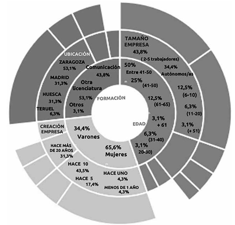 En cuanto al tamaño de la empresa, el 43,8% tiene entre dos y cinco trabajadores. El 34,4% es autónomo/a. El 12,5%, entre seis y diez. El 6,3%, entre 11 y 20 y el 3,1%, más de 51 trabajadores. Respecto a los estudios, el 43,8% tienen título universitario en Periodismo, Comunicación o Publicidad. El 53,1%, su grado o licenciatura proviene de otros estudios universitarios y el 3,1%, de otros grados.