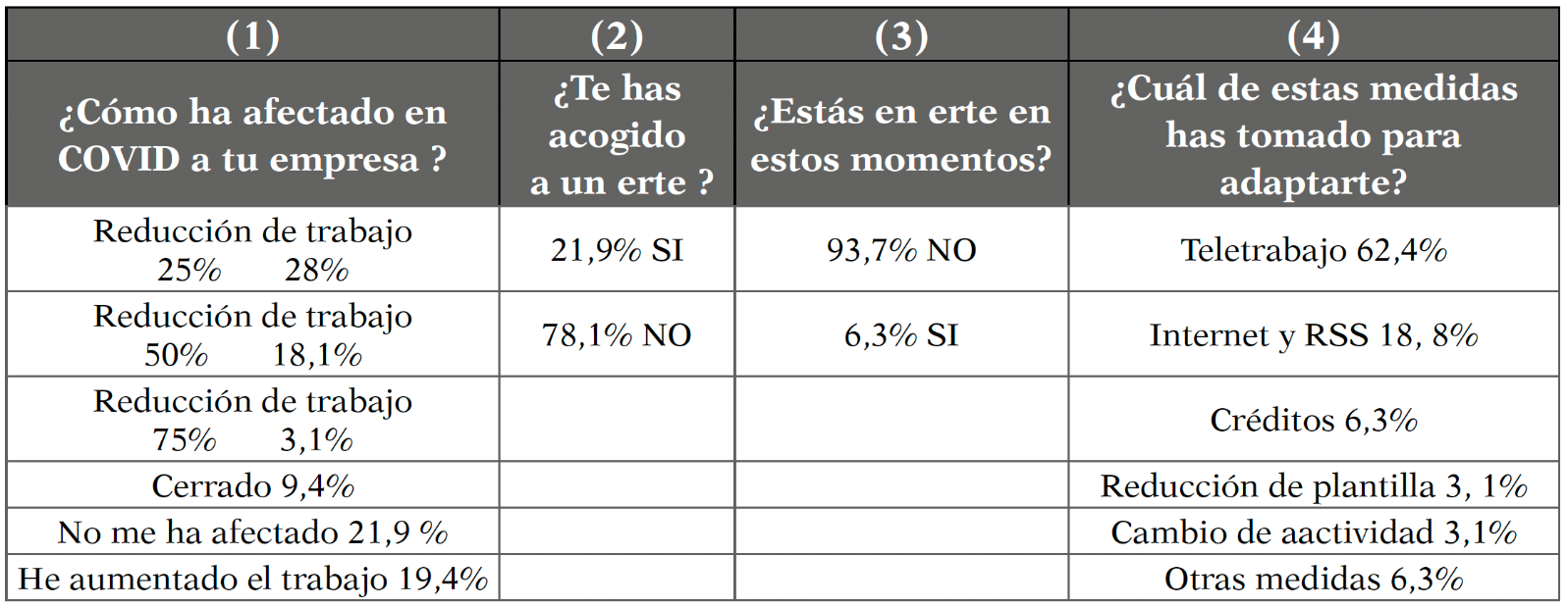 En la Tabla 3 se muestran las respuestas a las preguntas 1. ¿Cómo ha afectado la COVID-19 a tu empresa? 2. ¿Te has acogido a un erte? 3. ¿Estás en un erte en estos momentos? 4. ¿Cuál de estas medidas has tomado principalmente para adaptarte a la situación generada por la COVID-19?