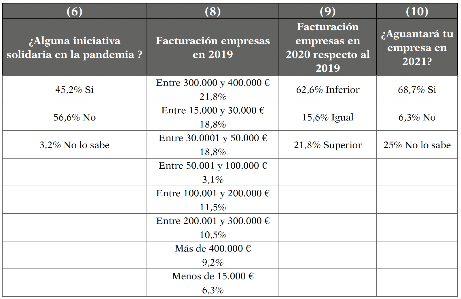 Y en la Tabla 5 se recogen las respuestas a las preguntas: 6. ¿Como empresa, has llevado a cabo alguna iniciativa solidaria durante la pandemia? 8. ¿Cuánto facturaba tu empresa al año, antes de la Covid-19? 9. ¿Cuál es tu facturación a finales de 2020 respecto a 2019? y 10. ¿Crees que tu empresa podrá aguantar abierta en 2021?