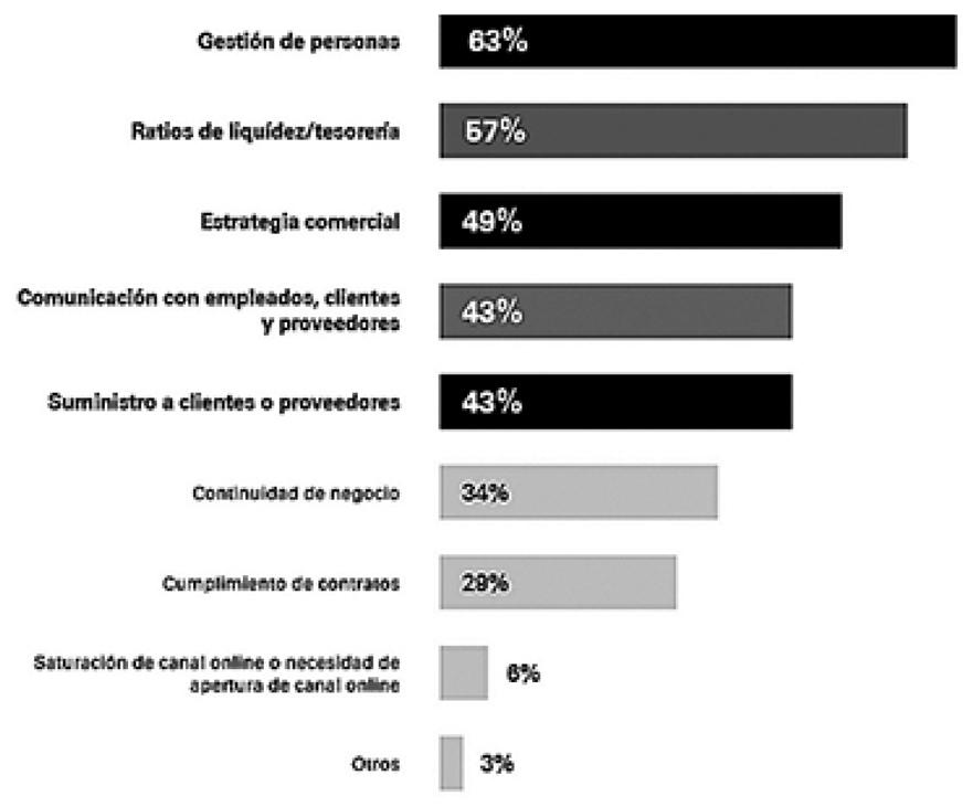 Las áreas funcionales más afectadas por la emergencia sanitaria han sido la gestión de personas, la tesorería y la gestión comercial. Ante esta crisis, las empresas grandes han aplicado diferentes medidas entre las que destaca también el teletrabajo que ha adoptado la gran mayoría de las pymes consultadas, hasta alcanzar el 96%.