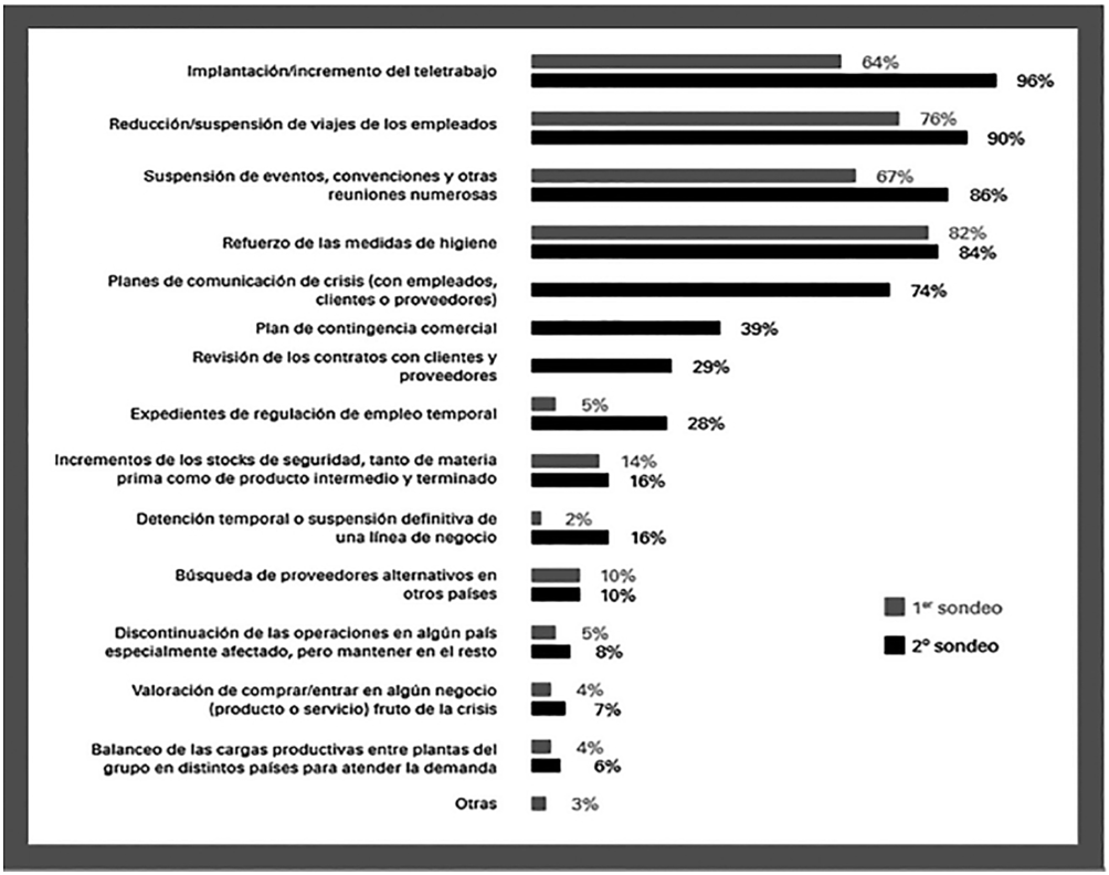 En el balance de situación sobre las empresas españolas, que de forma periódica realizan KPMG y CEOE (2020b), las personas directivas revelan que se han visto obligadas por la pandemia a adoptar medidas de forma rápida y más allá de sus planes estratégicos, con un doble objetivo. Por un lado, garantizar la salud y el bienestar de sus trabajadores y trabajadoras, proveedores y clientes, con el fin de contribuir con su responsabilidad a frenar la expansión del virus y, por el otro, mantener en la medida de lo posible su actividad, intentando contener los aspectos adversos que el coronavirus implica para su trabajo diario. Objetivos que coinciden con las actitudes reflejadas en las respuestas obtenidas de las pequeñas y medianas empresas encuestadas.