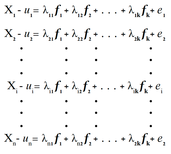 Donde: Xi representa son las variables observadas obtenidas de datos y que al estandarizarlos tendrán media E(Xi) = 0 y σ2 = 1 para toda i = 1, 2, . . ., p; las λ11, λ12, ..., λk son coeficientes de regresión, que en esta técnica se les denomina ponderaciones de los factores; las f1, f2, ..., fk son los denominados factores comunes latentes no observadas que se investigan, cada observación media E(Xi) = 0 y σ2 = 1; finalmente, los residuales ei o las perturbaciones poblacionales observadas de los factores únicos o específicos (García et al., 2017).