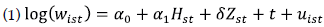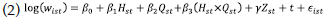 donde i = 1 , corresponde a las distintas combinaciones de los 32 estados 17 industrias, , es el porcentaje de trabajadores con estudios universitarios, es un vector de las características de las industrias, y es el residuo de la ecuación que captura componentes no observados de los trabajadores y los sectores en los estados, se asume que estos residuos están distribuidos de forma idéntica e independiente.