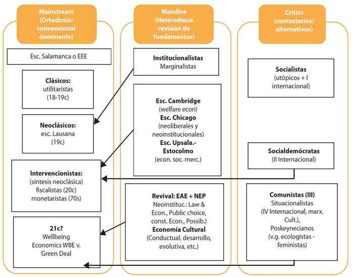 Los marcos ofrecidos por los enfoques económicos heterodoxos seleccionados son alternativos al mainstream (para su revisión de fundamentos) y complementarios entre sí (al considerar la economía como un proceso de creatividad y libertad, donde interactúan individuos racionales e instituciones pro-incentivos para un mayor bienestar): a) EAE ofrece una economía positiva, basada en principios y método deductivo (Menger, 1871; Mises, 1949; Huerta de Soto, 2000); b) Ancap ofrece una economía normativa, centrada en la realización de sus principios (Rothbard, 1962, 1973; Hoppe, 1993); c) EI ofrece una economía positiva basada en la combinación de principios y experiencias, además de recurrir a métodos deductivos e inductivos (lo que permite hablar de reglas generales y expresiones coyunturales o idiosincrásicas); d) NIE recoge el acervo de los anteriores, además de acercar planteamientos con la corriente mainstream; incluye los principales desarrollos disciplinarios dentro de NEP (incluido el enfoque posibilista, Hirschman, 1970, 1993). Otros argumentos a favor del uso de los enfoques heterodoxos son: a) su condición coetánea con el objeto de estudio (como mainline del siglo XIX, véase figura 1: a diferencia del enfoque de síntesis neoclásico, que dista más de un siglo y medio de diferencia), por lo que se evitan así errores anacrónicos complementarios; b) su recurso combinado por la disciplina Religion & Economics-R&E (desde la década de 1970, en el marco de EC).