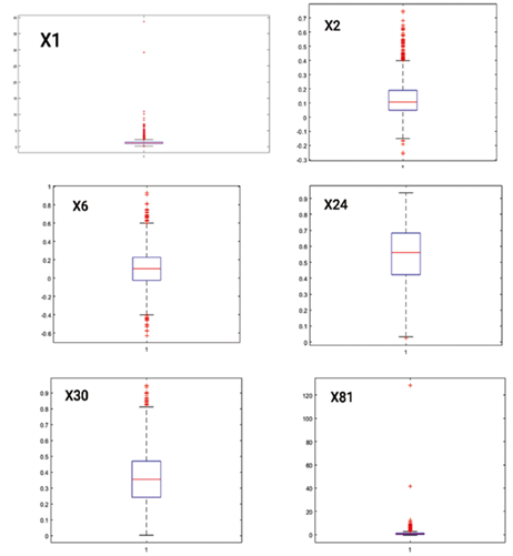 En esta sección, presentaremos los resultados obtenidos a través de la experimentación y discutiremos estos resultados con claridad. Después de haber organizado y distribuidos los datos en una muestra de capacitación y una muestra de prueba, procederemos a construir y desarrollar múltiples modelos para evaluar su capacidad para predecir dificultades financieras. Sin embargo, en primer lugar, se llevará a cabo un examen exhaustivo de los datos. Para ilustrar los datos se utilizan diagramas de cajas por varias razones. En primer lugar, los diagramas de cajas ofrecen información valiosa sobre la dispersión o variabilidad de los datos. En segundo lugar, proporcionan fiabilidad de la distribución de los valores. En tercer lugar, ayudan a identificar las regiones en las que los valores de la muestra están más densamente agrupados o son más escasos. Debido al gran número de variables independientes, concretamente 83, no es práctico crear un diagrama de caja independiente para cada variable. Por lo tanto, mostraremos selectivamente el diagrama de caja para un conjunto específico de variables, a saber, X1, X2, X6, X24, X30 y X81, elegidos al azar solo con fines ilustrativos. La figura 1 muestra los valores atípicos, representados en rojo, que se observan en dos áreas de la figura, ya sea que superen el valor máximo después de excluir los valores atípicos o que estén por debajo del valor mínimo después de excluir los valores atípicos.