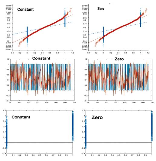 Cabe señalar que el modelo RQ-Cero mostró un rendimiento superior en comparación con el modelo RQ-Constante en todas las métricas presentadas en el cuadro 7. Por lo tanto, los resultados han mejorado, aunque marginalmente. Para obtener una visión más completa de los resultados de las pruebas para ambos modelos, utilizaremos la figura 3 y el cuadro 9 para presentar información más compleja y detallada. Presentamos las cifras de los modelos Constant-GPR y Zero-GPR, porque los resultados de estos dos modelos resultaron valiosos en comparación con los modelos anteriores. Esperamos aclarar la diferencia entre los dos modelos a través del gráfico residual, pero como se observa, la figura 3 no muestra una diferencia significativa entre los dos modelos debido a la convergencia de los resultados.