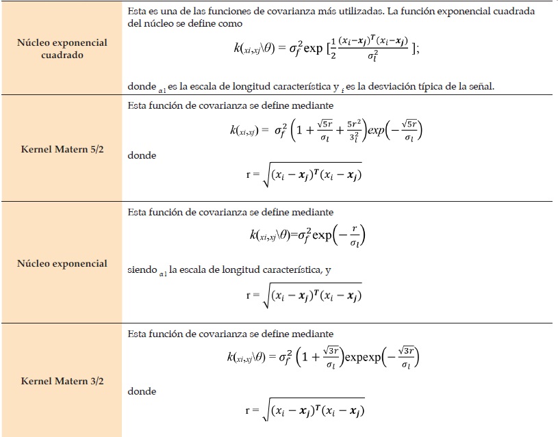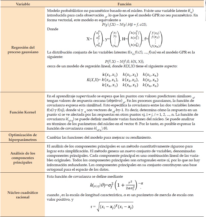 Donde m(x) y k(x,x′) son las funciones de covarianza y media de un proceso real f(x), respectivamente (Ferkousl et al., 2021). Solo define las funciones de covarianza y media para simplificar una función de un proceso gaussiano. La función de la covarianza k modela la variabilidad articular de las variables aleatorias del proceso gaussiano, y devuelve la covarianza modelada entre el par de entradas (Herfurth, 2020). El proceso gaussiano es un método robusto no paramétrico con modelos de incertidumbre precisos, utilizado principalmente en temas de clasificación y regresión. No es paramétrico porque el proceso gaussiano trata de inferir cómo todos los datos medidos están correlacionados en lugar de ajustar los parámetros de las funciones de base elegidas (Wang et al., 2023). Un proceso Gaussiano es un método de regresión probabilístico operativo, originalmente pionero en estadística y geofísica, que desde entonces ha encontrado una sólida base de usuarios en el aprendizaje automático. Un proceso gaussiano, considerado una técnica de regresión probabilística, toma un núcleo y un conjunto de datos como entrada y da la distribución de una función como salida (Asante-Okyere et al., 2018).