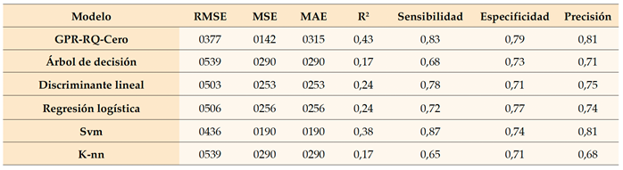 De acuerdo con los datos presentados en el cuadro 9, toda la evidencia disponible sugiere la superioridad del modelo RQ-Cero. Vale la pena señalar que un problema similar encontrado en el primer modelo también ocurrió en el modelo RQ-Cero, donde los valores de error fueron más altos en el primer año. Esta tendencia también puede observarse en el valor R2, ya que se preveía que la capacidad de clasificación del modelo sería mayor en el primer año y disminuiría gradualmente en los años siguientes. En este caso se observó lo contrario. En la etapa final, una vez identificado el modelo óptimo a partir de los modelos GPR, se procedió a comparar este modelo seleccionado con modelos de aprendizaje profundo como el modelo del árbol de decisiones, discriminante lineal, regresión logística, máquina de vectores de soporte y K-vecino más cercano.