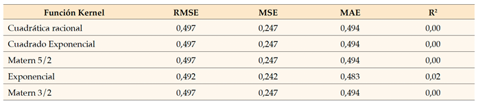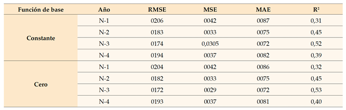 Para medir el valor de error se utilizaron los valores de raíz de error cuadrático medio (RMSE), error cuadrático medio (MSE) y error absoluto medio (MAE). Se empleó el coeficiente de determinación, denominado R2, como métrica estadística para evaluar la calidad del modelo y comprender la correlación entre las variables independientes y la variable dependiente, así como la correlación entre los valores observados y los valores predichos. Al analizar el cuadro 3, se observó que los resultados obtenidos podrían haber sido más satisfactorios. Sin embargo, estos resultados son inadecuados para ir a la segunda fase, es decir, a las “pruebas”. En esta fase, se observó que las medidas de precisión de predicción eran excesivamente elevadas y eran casi idénticas en todos los modelos. De igual forma, los valores de R2 fueron casi nulos para todos los modelos, indicando una falta de correlación entre los predictores y la variable dependiente, haciendo que los modelos sean estadísticamente insignificantes. Por lo tanto, esto sugiere la posibilidad de un desequilibrio producto del uso de la técnica de análisis de componentes principales (PCA), pero es contradictorio, ya que la técnica PCA normalmente contribuye a reducir el error y mejorar la calidad de la predicción. Por lo tanto, hay que investigar las causas de las medidas de error y la ausencia del coeficiente de determinación, por lo que el siguiente paso es descartar la técnica de PCA y evaluar si los resultados mejoran o empeoran. Posteriormente, en el cuadro 4, se descarta la técnica PCA, lo que arroja el siguiente conjunto de resultados.