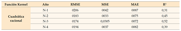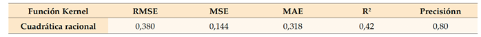 Al analizar el cuadro 4, se observa una disminución notable de los valores de las medidas de precisión de la predicción, lo que sugiere una disminución de las tasas de error. Esto significa una mejora en la calidad de la predicción de los modelos, que se ve corroborada por el aumento sustancial de los valores de R2. Sin embargo, es importante señalar que estos valores no se acercaron a 1, sino que se mantuvieron considerablemente alejados de cero. En consecuencia, los modelos han alcanzado significancia estadística y pueden explicar efectivamente la relación entre los predictores y la variable dependiente con un coeficiente de correlación de 0,444. Por lo tanto, podemos inferir que el uso del Análisis de Componentes Principales (PCA) contribuyó principalmente al desempeño por debajo del estándar de los modelos. Al comparar las medidas de precisión de predicción, es evidente que el modelo inicial que utiliza la función de núcleo cuadrático racional presenta valores de error más bajos en comparación con los otros modelos, así como valores R2 más altos. Además, este modelo alcanza el nivel más alto de significación estadística. Por lo tanto, no tendremos en cuenta los modelos restantes y optaremos por emplear este modelo para realizar pruebas en la fase posterior. Los resultados de las pruebas del modelo cuadrático racional, basados en las mismas medidas mencionadas anteriormente, se presentan en el cuadro 5.