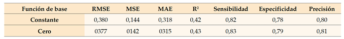 Los resultados de capacitación del modelo de relaciones lineales arrojaron resultados insatisfactorios, por lo que se omiten. Con base en los resultados de entrenamiento de los dos modelos restantes, se observa que tanto los valores de error como los valores de R2 muestran convergencia, aunque el modelo Cero ha mostrado un desempeño ligeramente superior. Estos hallazgos nos llevan a la fase de prueba y al análisis comparativo de los dos modelos, ya que los resultados de la capacitación han indicado el potencial para mejorar la precisión del modelo cuadrático racional. Los resultados descritos en el cuadro 8 presentan los siguientes resultados.