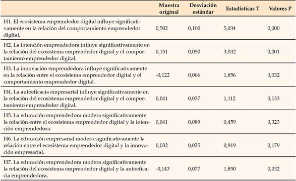 La innovación emprendedora media significativamente la relación entre el ecosistema emprendedor digital y el comportamiento emprendedor digital. La innovación emprendedora desempeña un papel crucial como mediadora para conectar el ecosistema emprendedor digital con el comportamiento emprendedor digital. De igual forma, sirve como catalizador del cambio, dirige la utilización eficaz de los recursos tecnológicos, impulsa la diferenciación del mercado, aumenta las capacidades de resolución de problemas, promueve estrategias disruptivas, aboga por la agilidad y la adaptabilidad, facilita la creación de valor, aprovecha las oportunidades de colaboración y cultiva una cultura que abarca la toma de riesgos y la experimentación. La autoeficacia empresarial media significativamente la relación del ecosistema emprendedor digital y el comportamiento emprendedor digital; también influye en el comportamiento empresarial digital al infundir confianza en los individuos. Cuando los emprendedores creen en su capacidad para manejar los desafíos del ecosistema digital, es más probable que tomen medidas proactivas y participen en actividades empresariales. La educación emprendedora modera significativamente la relación entre el ecosistema emprendedor digital y la intención emprendedora. La educación empresarial provee a las personas con una mejor comprensión del ecosistema empresarial digital, lo que les permite reconocer e interpretar las oportunidades dentro del ecosistema, influyendo en la fuerza de sus intenciones empresariales.
