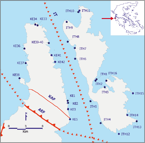 Dots represent the sites discussed in the text and listed in Tables II and III. Site names are also shown in this map, while the measurements and characteristics of each of these are listed in Tables II and III. Different lines depicted in this map correspond to the main faults in the study area, based on Sorel (1976) and Stiros et al. (1994). Specifically, AEF is the Agia Ephemia Fault and its inferred extension offshore, a major active reverse fault, KAF is the Kalon Anticline Fault, satellite fault in the hanging wall of the main fault and IT is the Ionian Trust.