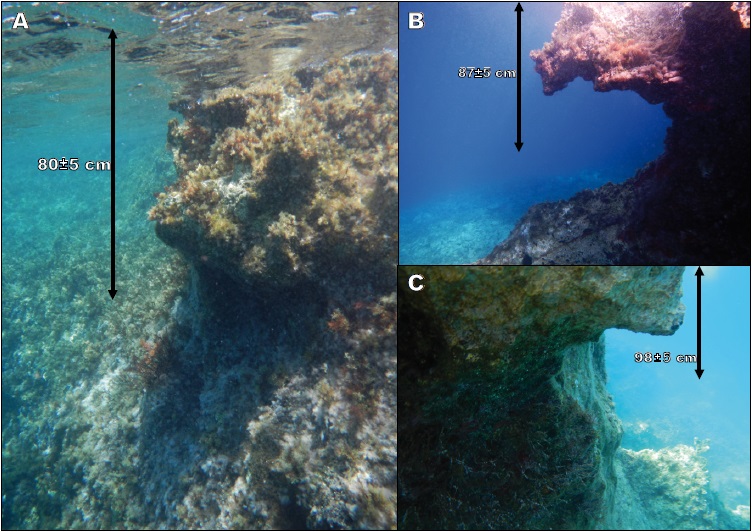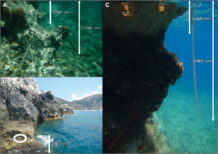 Measurements of the vertex depth below the apparent sea level of submerged notches at three sites in Ithaca (at -37cm at ITH2.1, at -45cm at ITH.3.1 and at -36cm at ITH15.1) revealed fossil erosion features that could, at first view, be considered as remnants of the “modern” notch, submerged 20 to 30cm by the global sea-level rise that occurred during the 19th and the 20thcentury (Evelpidou et al., 2012c; Pirazzoli and Evelpidou, 2013), possibly increased from a coseismic subsidence in 1953.