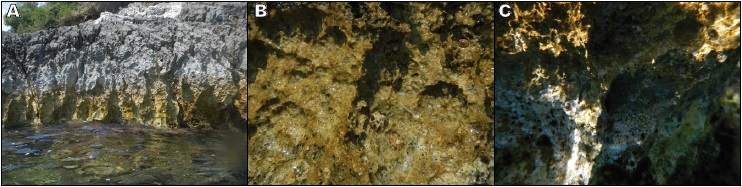 Sea urchins live only sub-tidally; they cannot tolerate exposure above sea level, even for a short time. An approximately 20cm wide leafy green algal cover from sea level down to the barren rock surface, where grazing sea urchins keep algae away, indicates that these animals live at depths of -0.3m and more. Although preservation is moderate, the notch in Figure 4B illustrates a complex history of subsidence followed by uplift (Fig. 7): i) the notch was formed in the intertidal zone, ii) subsequent minor subsidence into the sub-tidal zone allowed a population of boring sea urchins to leave their traces. These are the semicircular holes in the lower part of the notch (see the darkshadowed hole in the middle Figure 4B), iii) uplift raised the notch above the intertidal zone. The current surface is exposed to surf, producing karren. Following emergence the notch has been shaped by wetting and drying, while being grazed by numerous small littorinid snails (see Taboroši and Kázmér, 2013).