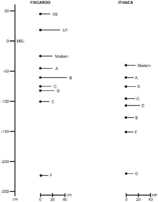 Former shorelines reveal only repeated subsidence in Ithaca, while Fiscardo bears evidence of similar subsidence alternated with undated occurrences of uplift. Some shorelines in Ithaca may have resulted from a tilting of the island, such as shoreline E, which suggests southward tilting.