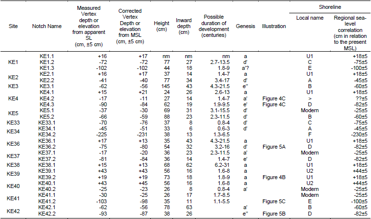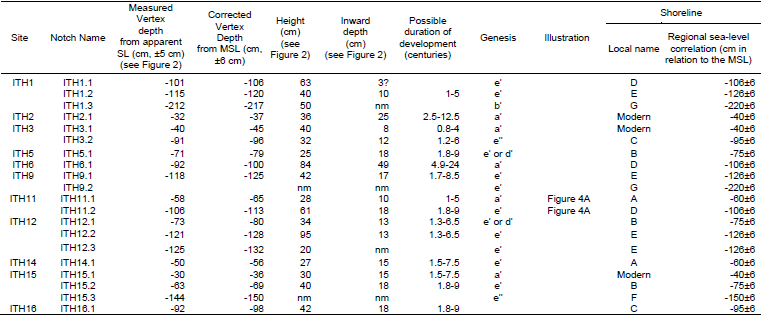 Tables II and III show the notch measurements at each site, the possible duration of development extracted from the inward depth, a possible genesis interpreted by the notch profile and a tentative regional sea level correlation for Ithaca island and Fiscardo peninsula, respectively.