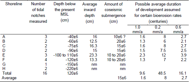In detail, the average coseismic subsidence has been 15±6cm, with an average return time between 1.6 and 8 centuries (Table IV). Assuming a medium value of 0.6mm/a for the intertidal bioerosion rate, the average return period of subsidence coseismic events would be 2.7 centuries.
