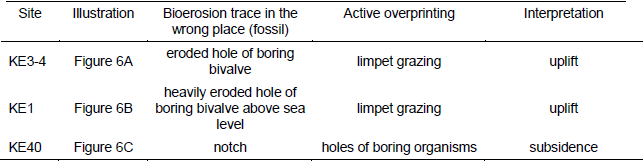 Bioerosional features were examined in order to make a preliminary interpretation of the sequence of events. In the absence of age markers, overprinted bioerosion features can describe alternating subsidence and uplift (Fig. 6; Table V) for a few of the very latest events. Overprinting of submerged intertidal notches with traces of sub-tidal boring sea urchins is obvious in Figure 4A, where living sea urchins are hiding in their own holes and empty holes are visible in the lower part of the image (the boring occurred after submergence). Overprinting of emerged notches by supratidal karrenis visible in Figure 4B, where the surface of the emerged notch in indurated limestone is exposed to surf, while the small, rounded, semicircular holes are probably former sea urchin boreholes (encircled), overprinted by surf karren, indicating a former subtidal depth.