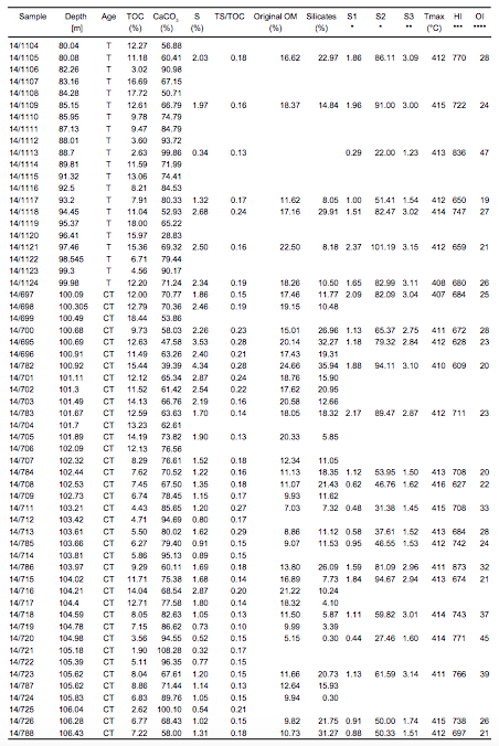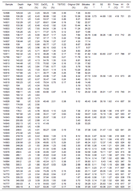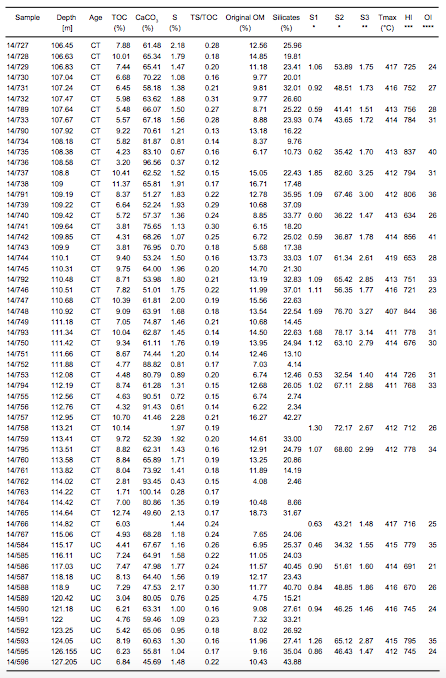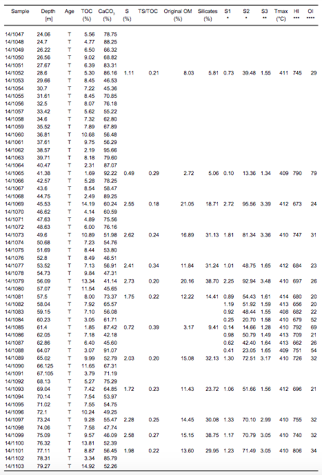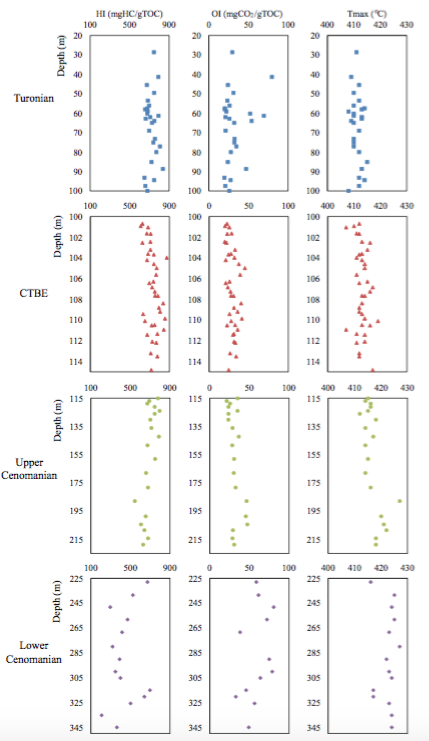 Rock-Eval pyrolysis analyses were conducted on 99 core samples to characterize their source rock potential using a Rock-Eval 6. The method is described in Espitalié et al. (1985) and Peters (1986). Samples cover the lower Cenomanian (14), upper Cenomanian (19), the CTBE interval (38) and Turonian (26). Various parameters were used from Rock Eval data. S1 (mgHC/gRock ) represents the free hydrocarbons and S2 (mgHC/gRock ) represents the non-soluble hydrocarbons with organic solvents (mostly kerogen). S3 represents the CO2 released from hydrocarbon during pyrolysis (mgCO2/gRock). Hydrogen Index (HI; S2/TOC; mgHC/gTOC) and Oxygen Index (OI; S3/TOC; mgCO2/gTOC) were calculated as common parameters to describe the quality of the source rock with respect to petroleum generation. Finally, the Production Index (PI) has been calculated as follows: S1/(S1+S2). All pyrograms were checked carefully for good S2 peak developments for quality control. Note that none of the Rock Eval samples have TOC lower than 0.5% or S2 lower than 1.5mgHC/gRock. Therefore, values of all parameters including Tmax and HI are believed to be accurate.