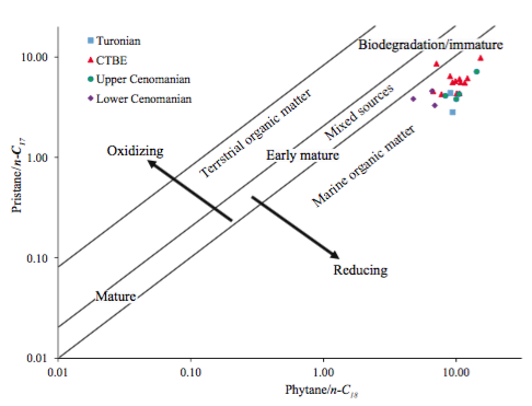 Molecular geochemistry data provides excellent environmental indicators. Various different parameters have been used. Pristane (Pr) and phytane (Ph) are two of the most prominent isoprenoids in petroleum samples that originate partly from the phytol side chain of chlorophyll a (Brooks et al., 1969; Powell and McKirdy, 1973; Didyk et al., 1978). Depending on the oxygen availability the diagenesis of phytol leads either to pristane under more oxic conditions or to phytane under more anoxic conditions (Koopmans et al., 1999; Peters et al., 2005). Therefore, the Pr/Ph ratio has been widely used to characterize the depositional environment (Brooks et al., 1969; Didyk et al., 1978; ten Haven et al., 1987; Powell, 1988). Pr/ Ph ratios lower than 1.0 usually indicate anoxic, marine carbonate lithology and values from 1.0 to 1.5 marine shale lithology. Values higher than 2 indicate deltaic shales or terrestrial environments (Peters et al., 2005). Furthermore, the correlation between the Pr/n-C17 and Ph/n-C18 is used to indicate in more detail kerogen types, depositional environments, thermal maturity and biodegradation (Peters et al., 2005). n-Alkane distribution can also be indicative of organic matter input. For example, high abundance of n-C15 to n-C21 (at low thermal maturity) indicates marine algae and high abundance of n-C25- n-C31 indicates vascular plant inputs (Yunker et al., 2005).