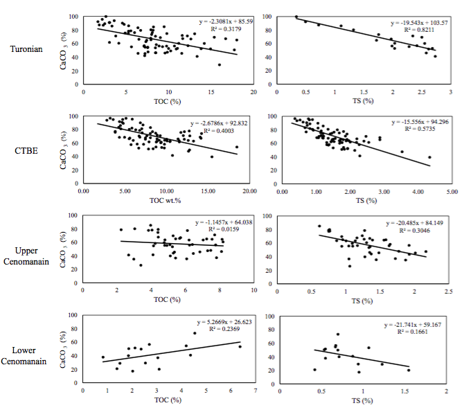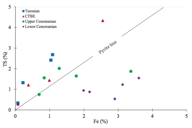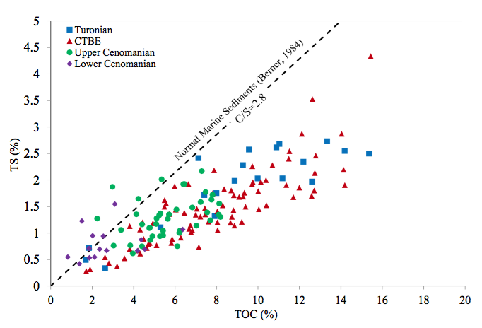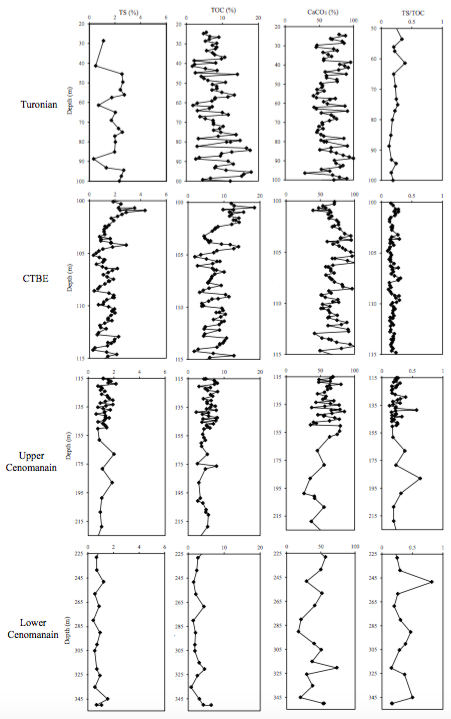 The CTBE source rocks are globally distributed and studied in great detail in North Africa and Mid-Atlantic regions (e.g. Herbin et al., 1986; Schlanger et al., 1987; Foster et al., 2004; Lüning et al., 2004; Jenkyns, 2010). All of the above mentioned studied locations exhibited high TOC values within wide ranges based on the depositional environmental conditions. Limited information is available on the kerogen sulfurization during the CTBE, but TS enrichments were recorded widely during this time.
