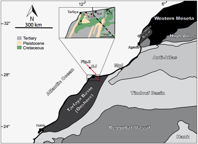 The Tarfaya Basin is located in southwest Morocco, south of the Anti-Atlas with the Reguibat massif in the east, the Mauritanides Mountains in the south and the Atlantic Ocean abyssal plain in the west (Fig. 1). It is considered as one of the main petroleum basins along the eastern Atlantic coast and belongs to the major oil shale deposits in Morocco (Dyni, 2006).
