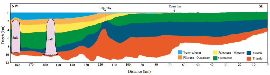 Exploration activities for conventional oil increased during the 1960s and early 1970s when several wells encountered gas and oil shows. This led to a heavy oil discovery offshore in the Jurassic play (SUBSEAIQ, 2014), ie. the Cap Juby field. In the 1980s, Shell assessed the Upper Cretaceous (Cenomanian/Turonian) succession in the onshore part of the basin for open pit oil shale mining; however, the deposits were regarded as non-commercial at that time (Lüning et al., 2004). The estimated total oil shale resource of the Tarfaya Basin is 86 billion tons with an average thickness of the mineable deposits of 20m (Dyni, 2006) and Total Organic Carbon content (TOC) of up to 20% for the Cenomanian (Kolonic et al., 2002; Sachse et al., 2011, 2012, 2014). Based on a well correlation (Michard et al., 2008) and an interpreted seismic line (Wenke, 2014; Fig. 2), the offshore basin differs from the onshore part, as in the offshore area a thick Tertiary succession and Triassic salt domes were identified (Fig. 2). This finding essentially increased the chance of finding more thermogenic oil and gas accumulations in the offshore area, where sufficient maturation of source rocks can be expected. In addition, the Canary hotspot is situated in direct vicinity to the Tarfaya Basin and might have affected heat flow leading to mature Cretaceous source rocks (see Neumaier et al., 2015), if this rocks are present on the offshore area.