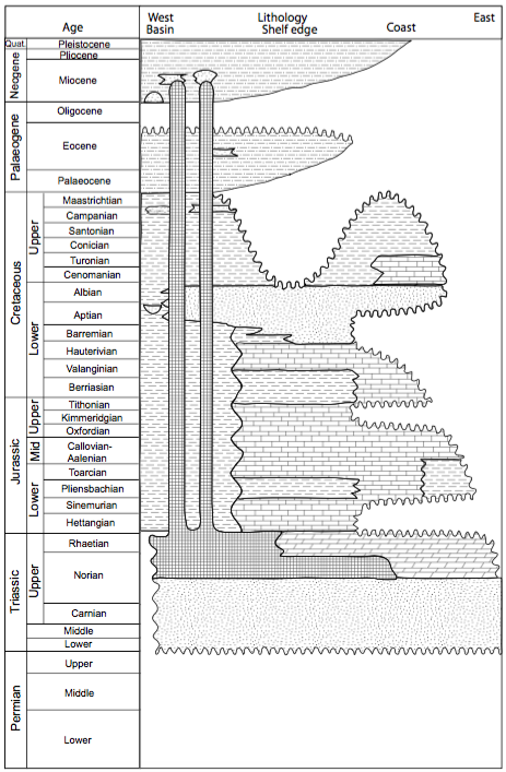 A major unconformity exists between the late Santonian and the Paleogene (Lancelot and Winterer, 1980; Hafid et al., 2008; Wenke et al., 2011). The Upper Cretaceous is thin or missing and unevenly distributed in the shallow water areas as shown in Figure 2. Interestingly, most of the Upper Cretaceous sediments are also eroded or undrilled in the Tarfaya deep water area. Another important transgression occurred in the Eocene resulting in upwelling and related high surface water productivity leading to deposition of organic matter-rich units (Sachse et al., 2014). This was followed by a time of non-deposition during the Early Oligocene (Lancelot and Winterer, 1980). Furthermore, the uplift of the Canary island volcanic region during the Miocene shifted the depocenter towards the abyssal part of the basin (Kuhnt et al., 2009). Finally, the latest stratigraphic section recorded in the Tarfaya is the Miocene Moghrebian Formation (Kolonic et al., 2002). Figure 2 is a cross section representing the distribution of the various stratigraphic units in the onshore and offshore areas. The most common lithologies are summarized in a generalized stratigraphic column (Fig. 3).