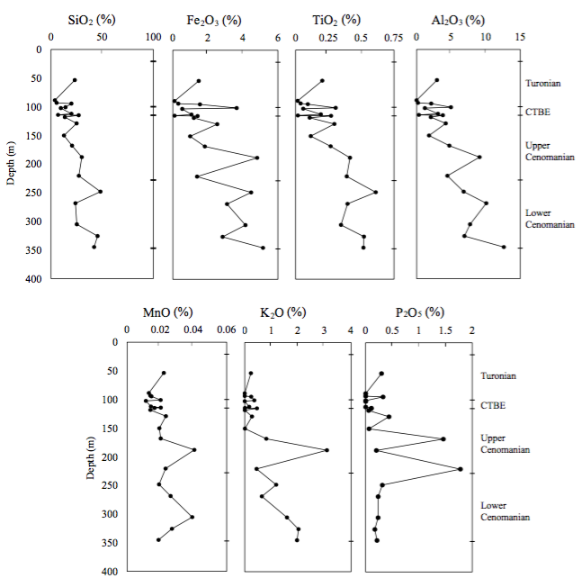 Organic petrology investigation clearly reveals that the samples are dominated by UOM and liptinite macerals indicating an aquatic, marine environment. The major element data reveal that the lower Cenomanian is rich in silicate minerals and rutile combined with elevated Fe2O3, SiO2, Al2O3, K2O and TiO2 concentrations indicating more terrigenous input as compared to the overlying, younger units which are carbonate-dominated (Fig. 6). All samples, especially those representing the CTBE are poor in MnO, indicating anoxic bottom water conditions (Calvert and Pedersen, 1993; Aquit et al., 2013 Moreover, phosphorous deposition decreases during increasing anoxic bottom water conditions. Simultaneously the increased availability of phosphorus in the upper water column increases the productivity which further results in declining the bottom water oxygen (Calvert et al., 1996). Phosphorus usually peaks before the onset of an OAE and retains to its background values after the end of the event (Mort et al., 2007; Jenkyns, 2010). In this well, phosphorous shows elevated values prior to, very low value within and slightly elevated values above the CTBE supporting the previously described hypothesis (Fig. 6). Similar observations of elevated P concentrations were found by Mort (2006) in the Cenomanian of the Mohammed Plage section (Mpl; Fig. 1) and by Nederbragt et al. (2004) in the S13 well. Elevated P concentrations prior to the onset of the OAE2 are characteristic of equatorial shelves of the MidCretaceous Proto-Atlantic Ocean as suggested by Kraal et al. (2010). These regional data are in accordance with the results in the current study.