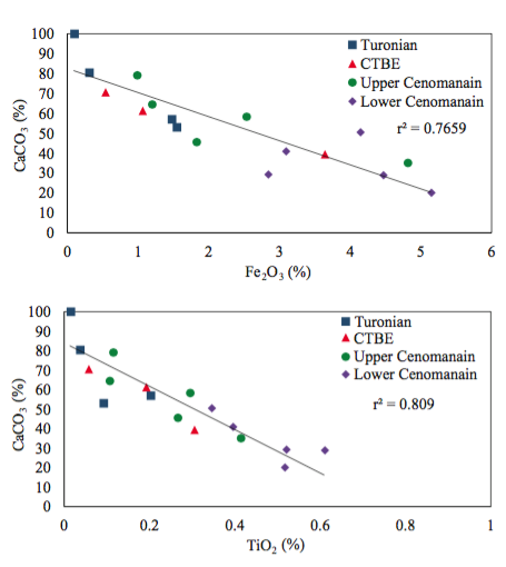 The Fe2O3, SiO2, Al2O3, K2O and TiO2 contents increase with well depth, reaching highest values within the lower Cenomanian (Table II; Fig. 6) whereas CaO, SO3 and LOI generally decrease with depth. Fe2O3 ranges from 2.8 to 5.1% in the lower Cenomanian and from 1.0 to 4.8% in the upper Cenomanian. A lower range is found in the samples representing the CTBE (0.1 to 3.6%). The Turonian has an even narrower range from 0.1 to 1.5%. The Fe2O3 and TiO2 show a negative relationship when they are plotted against CaCO3 (Fig. 7), which is in line with the decrease of CaO with depth. MnO is very low throughout the well and does not exceed 0.04%. MgO is relatively low but exceeds 3% in three samples (53.52m, 129.04m and 187.92m). The overall high Ca/ Mg ratio indicates that carbonates are mainly present as calcite/aragonite and not as dolomite. Accordingly the calculation of calcium carbonate content from total inorganic carbon (see elemental analysis method section) is valid for almost all samples. P2O5 shows high values only at 168.00m (1.5%) and at 220.57m (1.8%). More details are given in Figure 6 and Table II.
