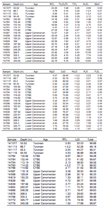 A total of 242 core samples were collected from Tarfaya Sondage-4. The well was drilled in 2009, located 40km east of Tarfaya (N27º59’46.4’’, W12º32’40.6’’) as part of a drilling campaign in order to recover the Miocene to Albian sequences. The borehole has a total depth of 350.20m with 100% sediment recovery. It penetrated 21.00m of the Miocene Moghrabien Formation, 79.00m of the Turonian, and 15.06m covering the CTBE interval, 163.04m of the upper Cenomanian and 72.1m of the lower Cenomanian and Albian section. The CTBE in this well was described in Schönfeld et al. (2015) where C isotope excursions were discussed. The boundary between the Lower and upper Cenomanian was tentatively based on changes in geochemical features. Detailed sedimentological and micropaleontological studies on the same well are currently conducted by the marine micropaleontology group at Christian-Albrechts University, Kiel, Germany. The two deepest samples were assigned to the Albian, but they are not discussed in detail due to their small number.