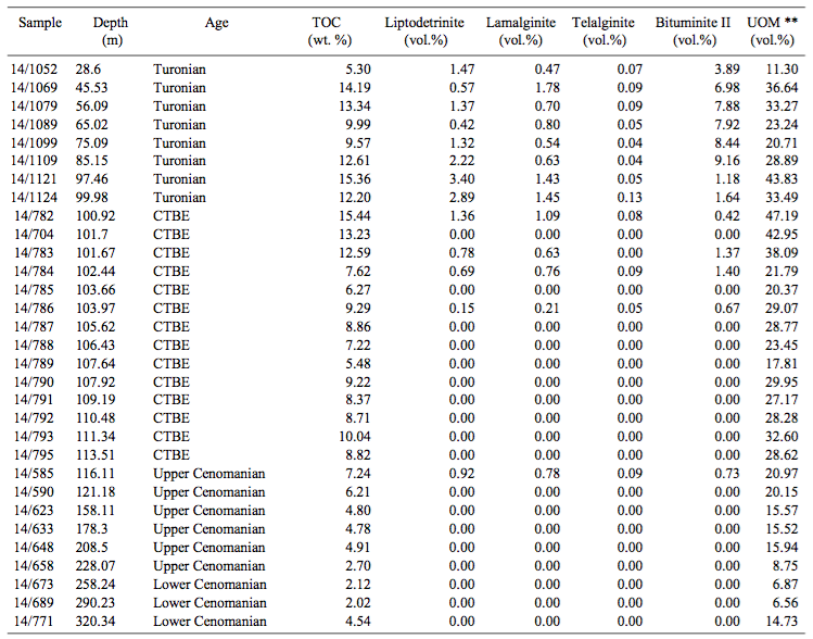The Turonian samples are similar to those of the CTBE, but with somewhat lower Sorg. They also differ from the CTBE in organic matter type especially in the younger interval (Turonian), where a high amount of bituminite is observed as well as alginite (Fig. 10A).