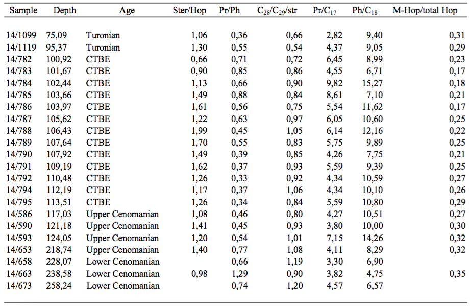 Using these molecular indicators the following sample characterizations can be deduced. The lower Cenomanian samples show Pr/Ph ~1 indicating marine shales and probably more oxic conditions compared to the other samples in this study (Table 2). These samples have a TOC of ~2%, HI values of about 500mgHC/TOC and relatively high OI values. Sample 14/653 from the lower/ upper Cenomanian boundary shows Pr/Ph lower than 1.0 indicating a change in the depositional environment. All these data suggest that a marine siliclastic depositional environment dominated in the lower Cenomanian, which later shifted to a more carbonate-dominated system. This is in agreement with the elemental data discussed before.