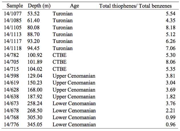 All samples show an elevated abundance of thiophenes (Table 3). The thiophenes/benzenes ratio shows very low values for the lower Cenomanian (0.98) then it increases to peak during the CTBE (8.06) and decreases slightly throughout the Turonian with values above 5.00.
