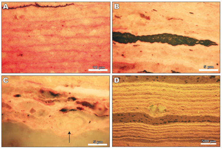 All studied samples consist of a finely-banded organomineral matrix displaying intense greenish-yellow and red fluorescence under blue violet reflected light (Fig. 10). The organic matter is optically amorphous. In some cases, authigenic quartz and dolomite crystals grew deforming the laminated material around them (Fig. 11). Pyrite clusters are present, as well as inorganic bodies, which have been determined to be sulfur aggregates. Marine planktonic foraminifera has been identified in samples from the Cenajo and Las Minas de Hellín basins and sponge spicules and diatoms are abundant in the Cenajo Basin samples (Fig. 11).