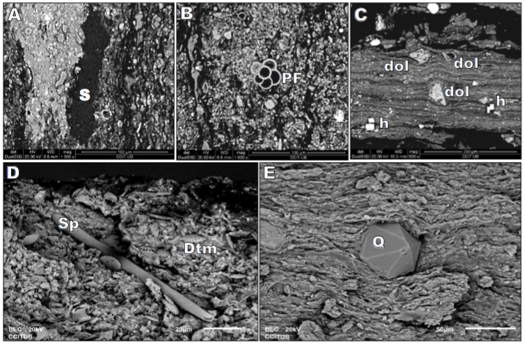 The presence of pyrite (Fe2S) associated to the studied organic-rich shales is related to the reaction between the Fe++ in solution and the H2S resulting from the previous reaction. Among the carbonates, dolomite seems to be the dominant authigenic mineral (Fig. 8). Massive dolomite deposits has been characterized in Las Minas de Hellín Basin as bio-induced dolomite, and related to sulfate reducing bacteria (Lindtke et al., 2011), then it is reasonable to consider that accumulation of these SRB represents an important contribution to these oil shales.