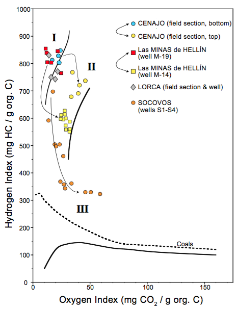The values of HI determined for Las Minas de Hellín Basin samples (well M-14) and those from the upper part of the Cenajo field section indicate a type II-S kerogen interpreted to be of marine origin. Whereas HI for samples from the lower part of the Cenajo field section and samples from well M-19 of the Las Minas de Hellín basin, falls within type I-S kerogen interpreted as lacustrine (Espitalié et al., 1985/1986). In the Socovos Basin, the HI ranges from 700 to less than 350 for samples from the S-2 and S-4 boreholes, suggesting kerogen II-S to type III. However no terrestrial input has been observed under the microscope.