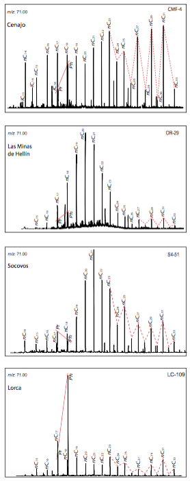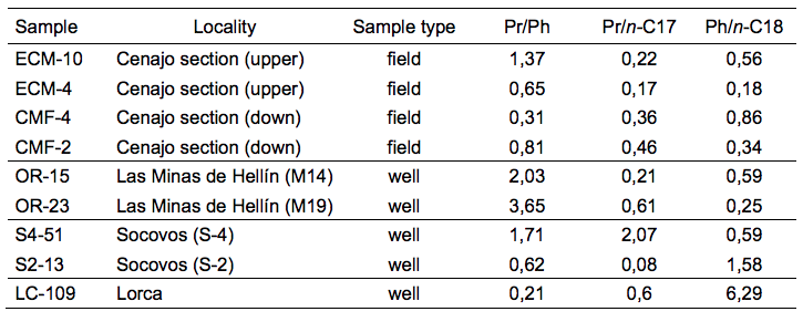 Gas chromatograms of saturated hydrocarbons are shown in Figure 13. Distribution of n-alkanes mainly shows high odd predominance between n-C23 and n-C33 n-alkanes in all samples. The distribution of n-alkanes between n-C19 and n-C23 is predominant in the Las Minas de Hellín and Socovos basins. In the Cenajo Basin, n-alkanes present a more extended homologous series from n-C16 to n-C23. Isoprenoids, like pristane and phytane, show a higher abundance of phytane over pristane (Fig. 13). In the Cenajo, Las Minas de Hellín and Lorca basins the pristane/phytane ratio varies from 0.2 to 0.55, pristane/n-C17 range from 0.31 to 0.78, and ph/n-C18 between 0.31 and 0.54 (except in Lorca Basin: 8.57) while in the Socovos Basin, the pristane/phytane ratio is 2 (Table III).