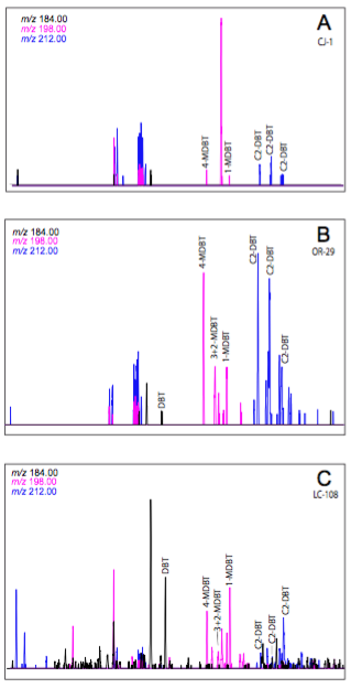 Sulfur is present in all studied samples. Values are up to 9% in the Cenajo Basin, 19% in Las Minas de Hellín and 28% in Socovos Basin (Table I). These contents are in the same range of those previously determined in the Lorca Basin (Permanyer et al., 1994). Organic Sulfur Compounds (OSC) were determined by GCMS. Figure 14 (benzothiophenes) shows the main OSC present in the Cenajo, Socovos and Lorca basins. The dominant organic sulfur compounds are dibenzothiophene, methyldibenzothiophenes and C2- alkyl-dibenzothiophenes.