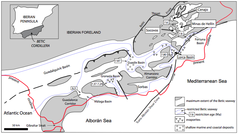 Since the late Tortonian, a NNW-SSE regional compression accompanied by an isostatic readjustment was established in Southeastern Spain. This geodynamic situation produced a general uplift in the Betic Cordillera that was responsible for the formation of a mosaic of interconnected marine corridors between the Atlantic Ocean and the Mediterranean Sea with post-orogenic basins separated by an archipelago of islands. The progressive uplift of the Cordillera caused the disconnection between the different internal basins and their progressive restriction and isolation leading to evaporitic conditions (Ott d’Estevou and Montenat, 1985; Sanz de Galdeano, 1990; Sanz de Galdeano and Vera, 1992).