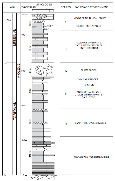 Cyclic diatomitic unit with a metric alternation of marls and diatomite beds. This indicates an environment with an alternation of relatively wet (diatomite) and dry (marl) episodes. The stable isotopic composition of the carbonates indicates a general trend towards diluted conditions upwards in the section (Bellanca et al., 1989).