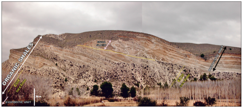 Slump dominated interval, interpreted as a seismites succession (Calvo et al., 2014). This interval reach a thickness of 40m (Cenajo Basin) and consist of deformed and resedimented marls, carbonates and diatomites.