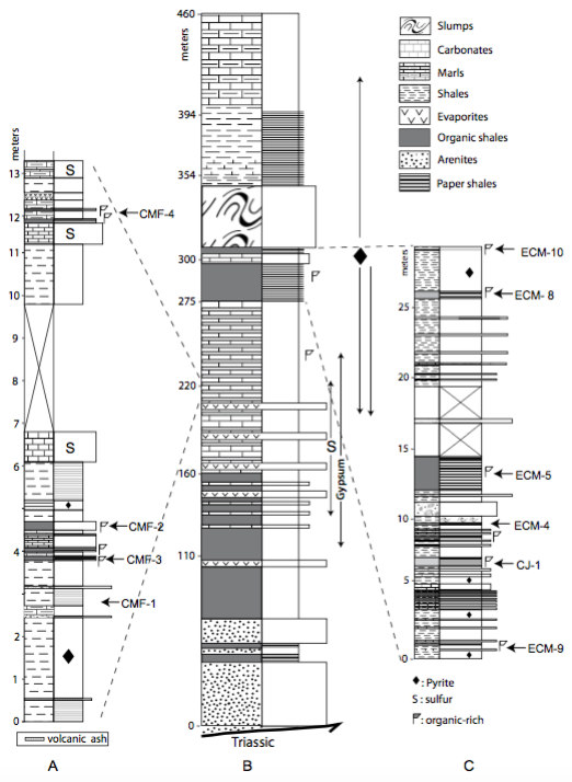 In all studied basins, native sulfur is present in the deposits associated to the organic shales in a quantity important enough to be exploited commercially. All sedimentary sulfur ores occurs in evaporitic basins related to hydrocarbons or organic rich deposits (Ortí, 2010; Permanyer et al., 1991), where under anoxic conditions the bacterial reduction of the sulfate ion produced Hydrosulfuric acid (H2S) and bicarbonate (HCO3). The Sulfate Reduction Bacteria (SRB) activity avoids the precipitation of gypsum and generates H2S which is later oxidized forming sulfur nodules: