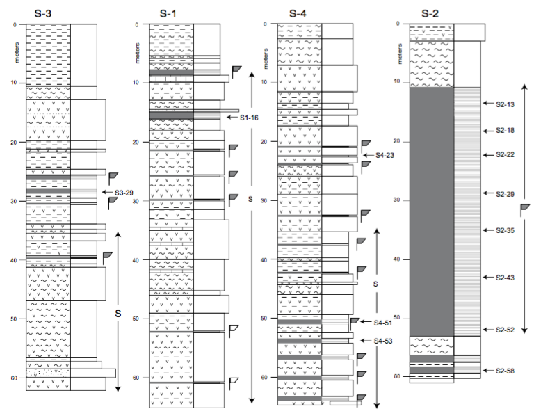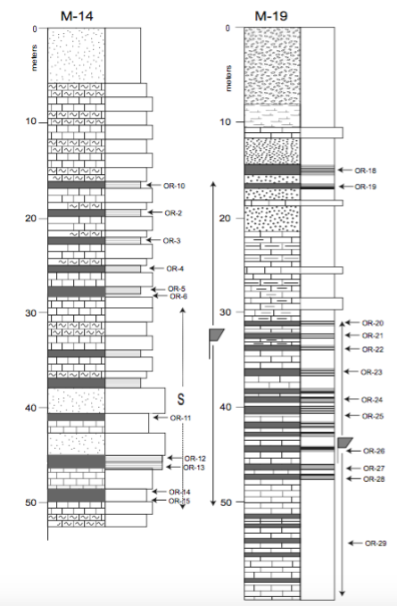 All samples (n=70) were geochemically analyzed with a Rock Eval II pyrolysis device (RE), equipped with a carbon module. The sulfur content was determined by elemental analysis. Selected samples were powdered and then extracted with CH2Cl2, and extracts were fractioned into saturated and aromatic hydrocarbons, and polar compounds. Gas Chromatography - Mass Spectrometry (GCMS) full scan analyses were carried out on a Shimadzu QP2010 gas chromatograph-mass spectrometer with a DB-5 Agilent Technologies column (60m x 0.25mm i.d. × 0.1μm film). GC conditions were using a splitless injector at 280ºC, and helium was used as a carrier gas with a constant flow rate of 1ml/min. The oven temperature was programmed to run from an initial temperature of 40ºC (held for 1min) to a final temperature of 300ºC at 2ºC/min, and then held at 300ºC for 60min. The mass spectrometer was operated in full scan electron impact mode (electron input energy, 40eV; source temperature, 200ºC) and the data were analyzed with Shimadzu software.